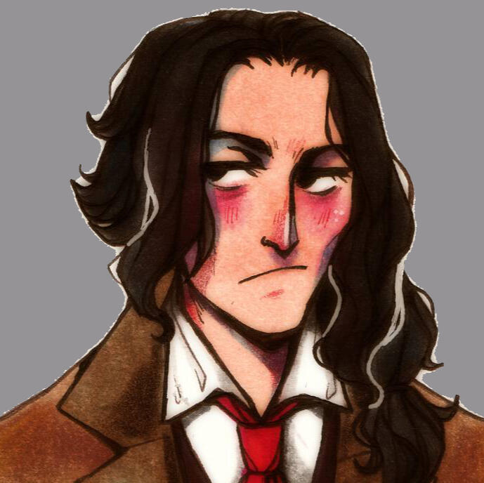 'can i get you anything? or have you just come to chat for a while?'cyrus (he/him) is the bartender of the red dream. reliably located at his post behind the bar, he prepares every drink ordered. on rare occasions that patrons visit the bar and speak with him, not at him, he averts his eyes, focusing on drying an endless stream of glasses rather than telling you how he feels...